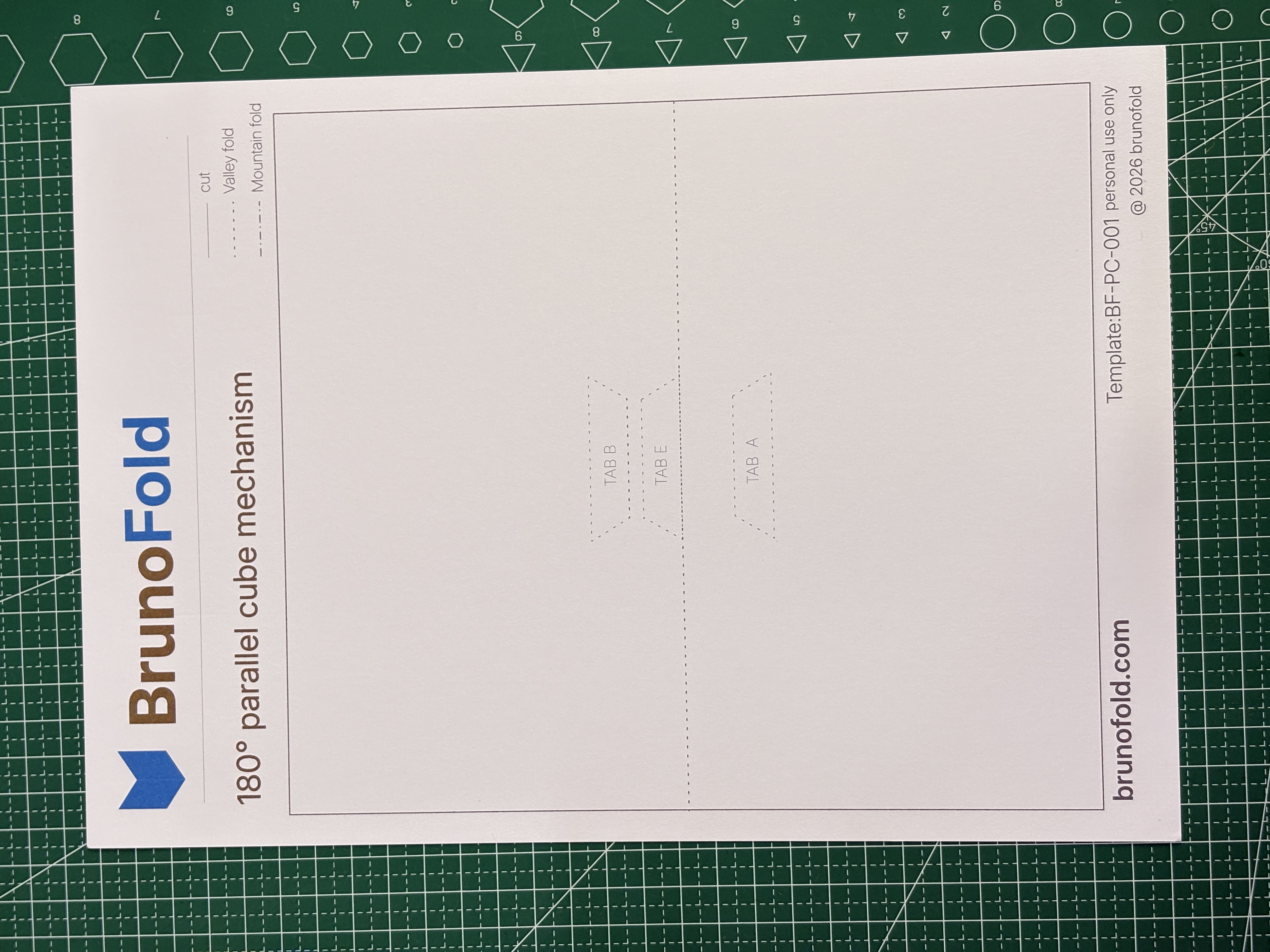 The 180 degree parallel cube mechanism is a classic pop-up structure built from parallel fold lines. As the page opens from the closed state to 180 degrees, the flat layout expands into a complete and stable cube form.